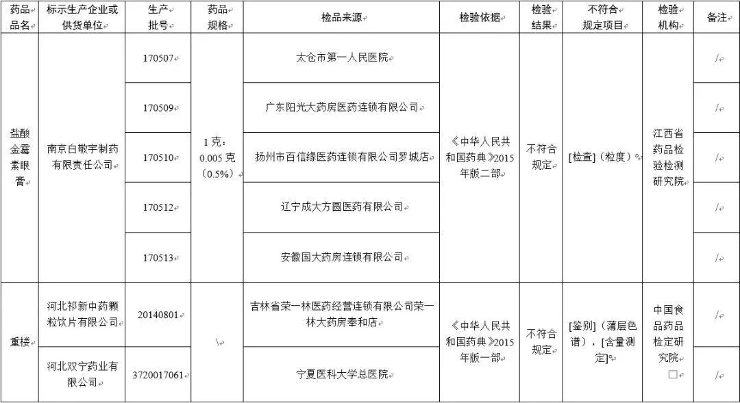 | 河北人注意了,以下这几种药被全国叫停,赶紧翻翻自家药箱,家里有的赶紧扔了吧! 日前,国家药监局发布通告称,经江西省药品检验检测研究院等4家药品检验机构检验,标示为南京白敬宇制药有限责任公司等16家企业生产的36批次药品不符合规定。 ![]() 其中,盐酸金霉素眼膏有20批次,重楼、地黄(熟地黄)、山药等共有16批次。对上述不符合规定药品,相关药品监督管理部门已要求相关企业暂停销售使用、召回产品,开展不符合规定原因调查,并切实深入进行整改。 不合规药品详情 经江西省药品检验检测研究院检验,标示为南京白敬宇制药有限责任公司生产的20批次盐酸金霉素眼膏不符合规定,不符合规定项目为粒度。 经中国食品药品检定研究院检验,标示为河北祁新中药颗粒饮片有限公司、河北双宁药业有限公司生产的2批次重楼不符合规定,不符合规定项目包括薄层色谱、含量测定。 经河南省食品药品检验所检验,标示为安国市平安药业有限公司、亳州市远光中药饮片厂、宜宾仁和中药饮片有限责任公司、四川盛世锦荣药业有限公司、兰州旭康药业有限公司、新疆奇康哈博中维药饮片有限公司生产的6批次地黄不符合规定,不符合规定项目包括总灰分、酸不溶性灰分、含量测定。 经河南省食品药品检验所检验,标示为河北济鑫堂药业有限公司、云南金发药业有限公司等4家企业生产的4批次山药不符合规定,不符合规定项目为总灰分。 经山西省食品药品检验所检验,标示为重庆市渝和堂药业有限公司、成都欣福源中药饮片有限公司、四川原上草中药饮片有限公司生产的4批次羌活不符合规定,不符合规定项目包括性状、含量测定。 处置情况 对上述不符合规定药品,相关药品监督管理部门已要求相关企业暂停销售使用、召回产品,开展不符合规定原因调查,并切实深入进行整改。 国家药品监督管理局要求相关省级药品监督管理部门对上述企业和单位依据《中华人民共和国药品管理法》第七十三、七十四、七十五条等规定对生产销售假劣药品的违法行为进行立案调查,自收到检验报告书之日起3个月内完成对相关企业或单位的调查处理并公开处理结果。 36批次不符合规定药品名单 ![]() ![]() ![]() ![]() ![]() 备注:标“*”的药品为标示生产企业否认为该企业生产。