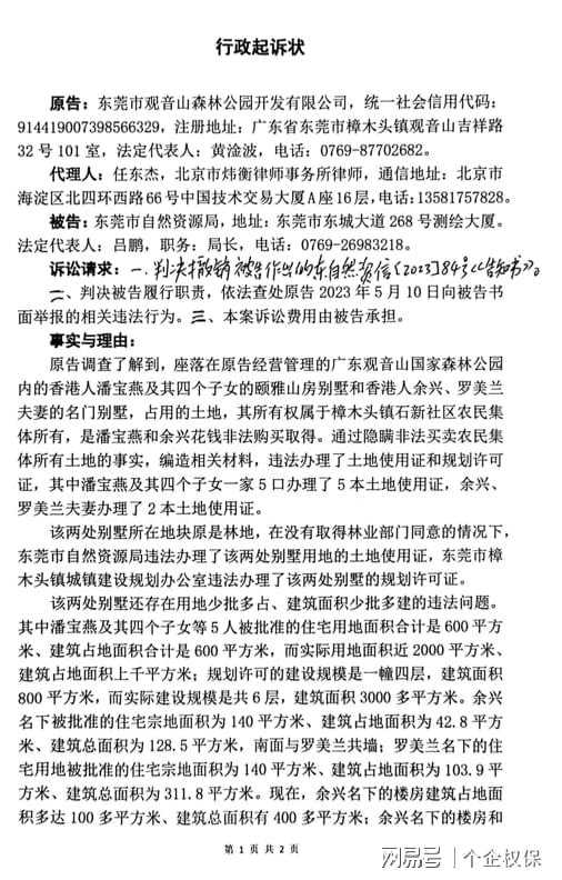 东莞市第一法院法官朱珍珍、王海建、易菲菲枉法裁判被实名举报 独立撰稿人 李海波 近日,广东观音山国家森林公园对东莞市第一法院法官朱珍珍、王海建、易菲菲故意违背事实和法律作枉法裁判违纪违法行为向各级法院和人大进行了实名举报。 实名举报信。送达单位为:东莞市第一人民法院及林辉芳院长和纪检监察组、东莞市中级人民法院及陈小辉院长和纪检监察组、广东省高级人民法院及张海波院长和纪检监察组、最高人民法院及张军院长和纪检监察组;东莞市人大常委会、广东省人大常委会。 监督申请书 同日,观音山还向东莞市检察院提起了监督申请书,请求对第一法院提出检察建议,对法官朱珍珍、王建海、易菲菲依法处分。 举报信认为:东莞市第一人民法院法官朱珍珍、王建海、易菲菲,在办理我单位东莞市观音山森林公园开发有限公司诉东莞市自然资源局行政不作为一案中,公然官官相护,故意违背事实和法律作出枉法裁判,实为少见。从该案办理情况看,他们已经丧失公正之心,不能秉公办案,依法应受处分,且不宜继续任职法官。因此,举报人实名举报,恳请上述单位监督和责令法院对他们依法处分并提请同级人大常委会免除他们的法官职务。 香港人竟在国家森林公园内建豪华别墅 还有农村宅基地证 在举报人经营管理的4A级景区广东观音山国家森林公园里面,有香港人余兴、罗美兰夫妻和香港人潘宝燕及其四个子女名下的两处豪华私家别墅,每处占地三四亩、建筑面积二三千平,竟然还都办有农村宅基地证。 举报人调查发现,该两处别墅用地,是潘宝燕和余兴分别于1997年和2005年花了几十万港币从所有权人樟木头镇石新村(现改为社区)和他人手中非法购买取得,然后,通过隐瞒非法买卖农村集体土地的事实,编造相关材料,违法办了农村宅基地证和规划许可证,其中潘宝燕及其四个子女一家5口办理了5本宅基地证,余兴、罗美兰夫妻办理了2本宅基地证。虽然当年的法律规定,回家乡定居的香港居民可以申请农村宅基地,但是,余兴、罗美兰夫妻与潘宝燕及其四个子女,都是香港居民,石新村也不是他们的家乡。所以,他们不可能依法取得农村宅基地,并且国家禁止农村集体土地非法买卖,对农村宅基地实行“一户一宅”。据此,举报人认为东莞市自然资源局给他们办理宅基地证、樟木头镇城镇建设规划办公室给他们办理规划许可证,肯定是违法的。 举报人调查还发现,该两处别墅用地原是林地,办理宅基地证和规划许可证,没有依法取得林业部门的同意,也没有依法办理农用地转用审批手续。 该两处别墅还存在用地少批多占、建筑面积少批多建的违法问题。 其中潘宝燕及其四个子女等5人被批准的住宅用地面积合计是600平、建筑占地面积合计是600平,而实际上他们住宅用地面积近2000平、建筑占地面积上千平;规划许可的建设规模是一幢四层、建筑面积800平方米,而实际建设规模是共6层、建筑面积3000多平。余兴名下被批准的住宅宗地面积为140平、建筑占地面积为42.8平、建筑总面积为128.5平,南面与罗美兰共墙。罗美兰名下的住宅用地被批准的住宅宗地面积为140平、建筑占地面积为103.9平、建筑总面积为311.8平。而实际上,余兴名下的楼房建筑占地面积多达100多平、建筑总面积有400多平;余兴名下的楼房和罗美兰名下的楼房中间有四五米宽的过道,两栋楼房并没有共用一堵墙:夫妻俩人的别墅合计占地面积近2000平、建筑面积含地下室四层超过了2000平。 樟木头镇城镇建设规划办公室违反宅基地证上的批准,2005年将余兴的建设规模许可变成1栋3层393平,将罗美兰的建设规模许可变成1栋3层共450平。樟木头镇城镇建设规划办公室不仅对潘宝燕及其四个子女在1998年没有取得规划许可的情况下违法建房的行为不予查处,反而在2002年为其补办了规划许可证,并将规划许可证的办理日期违法提前到1998年违法建房时的日期,以掩盖潘宝燕及其四个子女没有取得规划许可就建房的违法事实。并且,樟木头镇城镇建设规划办公室还出具虚假证明材料,谎称潘宝燕等5人的住宅楼共四层、建基面积600平、总建筑面积为800平,符合镇建设规划要求,同意办理房地产权登记。 起诉至东莞市第一法院,法官故意违背事实驳回起诉 举报人调查了解到的樟木头镇违法为香港人办理产权证的情况,在2023年5月10日向东莞市自然资源局提交了书面举报材料。但是,东莞市自然资源局却于2023年5月24日书面告知举报人,根据《中华人民共和国土地管理法》第七十八条及《广东省人民政府关于农村村民非法占用土地建住宅行政执法权的公告》(粤府函[2020]84号)相关规定”,建议“向樟木头镇人民政府反映”。 《中华人民共和国土地管理法》第七十八条及《广东省人民政府关于农村村民非法占用土地建住宅行政执法权的公告》明确规定的违法主体是农村村民,而没有包括非农村村民。举报人认为,东莞市自然资源局明知余兴、罗美兰夫妻和潘宝燕及其四个子女都是香港人,不具有石新村村民的身份,却错误适用《中华人民共和国土地管理法》第七十八条及《广东省人民政府关于农村村民非法占用土地建住宅行政执法权的公告》,认定举报人所投诉事项的执法权限不属于其权限范围而让去樟木头镇政府反映,这是典型的推卸职责,是懒政和不作为。于是,举报人提起行政诉讼,要求判决