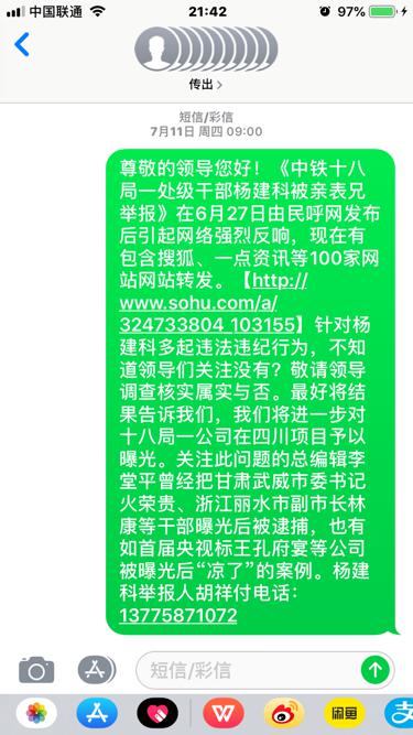 中铁十八局项目经理杨建科涉嫌多起违法火爆网络,百余领导无动于衷 独立撰稿人 李海波  6月28日,法讯网发布了《中铁十八局一公司项目经理杨建科被亲表兄举报》,搜狐、一点资讯、凤凰网等近百家网站予以转发,引起广大网友强烈反响。 7月11日,法讯君按照胡祥付提供的百余位中铁领导陆续发了短信,请求领导予以了解回复。之后胡祥付也给领导们发了短信。 这位中铁领导很不耐烦,不知道是什么职位 这位部长态度,我们只能呵呵 中铁需要这种领导多一点 7月14日的这律师函值得推敲,一是没有说文章链接,谁知道是哪个网页?二是说是诽谤,你倒说下哪里诽谤了?胡祥付举报事实清楚,图文并茂,你得具体阐述一下啊!三是这律师是中铁十八局一公司职员,怎么一转眼是律师了?四是7月14日的律师函,直到7月19日下午5:10才发出。个中原因只有当事人清楚,法讯君不便猜测。  鉴于此,法讯网没有理会该函件。 中铁十八局一公司给这位假记者(胡祥付向民主与法制社投诉其收了五万元的事情,社里答复没这人,但表示介绍信是真的)的回复也说明杨建科存在一些问题,但就是没有书面答复给胡祥付。 至此,曝光已经过去二个多月了,但中铁方面没有丝毫动静。 杨建科居然是文明家庭标兵。 杨建科只有唯一一家全家福,果真是因为忙吗?看看下面的这小老婆和儿子图片,也没有杨建科本人呢! 杨建科情人王诺(杨建科叫蛋妈)和儿子留影 他包养小老婆所生儿子都6岁了,项目部的人都清楚!将杨建科上报为文明家庭标兵,中铁十八局的职工们是否都是以他为标准而生活和工作的?! 胡祥付表示还将爆出更多中铁十八局第一公司的更多问题,并对真实性负一切法律责任。