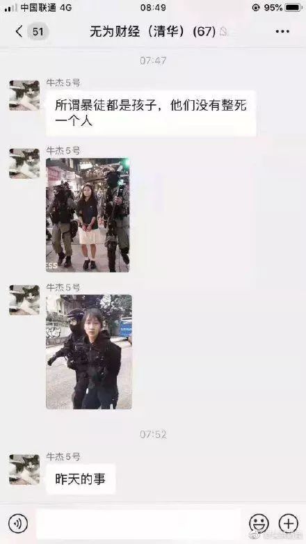 13日,社交媒体上有人爆出一位账号为“牛杰5号”的网友在微信群组中发表涉香港不当言论的多张截图,引发舆论关注。该网友在群组中称“所谓暴徒都是孩子,他们没有整死一个人”。有网友对比表示愤怒。 南昌航空大学微博截图 特此公告 首先感谢网友们对南昌航空大学的关心与帮助。在看到相关信息后,我校第一时间进行调查。经核实,发表不正当言论的牛杰确系我校文法学院教师。学校对此高度重视,将严格依规予以严肃处理。 13日,社交媒体上有人爆出一位账号为“牛杰5号”的网友在微信群组中发表涉香港不当言论的多张截图,引发舆论关注,有网友表示愤怒。 微博截图 图自微博