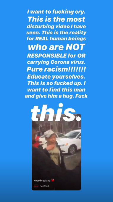 | 模特Bella hadid晒出这段视频截图,并在社交网站发声抵制歧视。贝拉称:“我想哭,这是我见过最不安的录像。” Bella hadid Bella hadid新浪娱乐讯 据外媒,近日,一名亚洲老人在旧金山的一个社区里拾取瓶子,被当地一群人围着嘲笑、羞辱、人身攻击,这名老人只能无措的在原地,最后伤心的哭起来还被拍视频的人怼脸上拍摄。26日,模特Bella hadid晒出这段视频截图,并在社交网站发声抵制歧视。贝拉称:“我真的很想哭,这是一个让人十分不安的视频,看到了这现实是多么残酷。这些人没有携带新冠状病毒,但却因为纯粹的种族主义被歧视,请自我反思,我真的很想找到这个人给他一个拥抱安慰”。 |